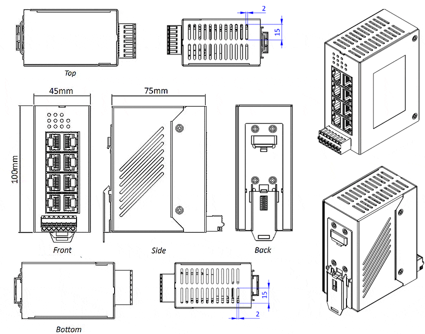 Mechanical drawings of IDS-108FE Industrial Gigabit Switches